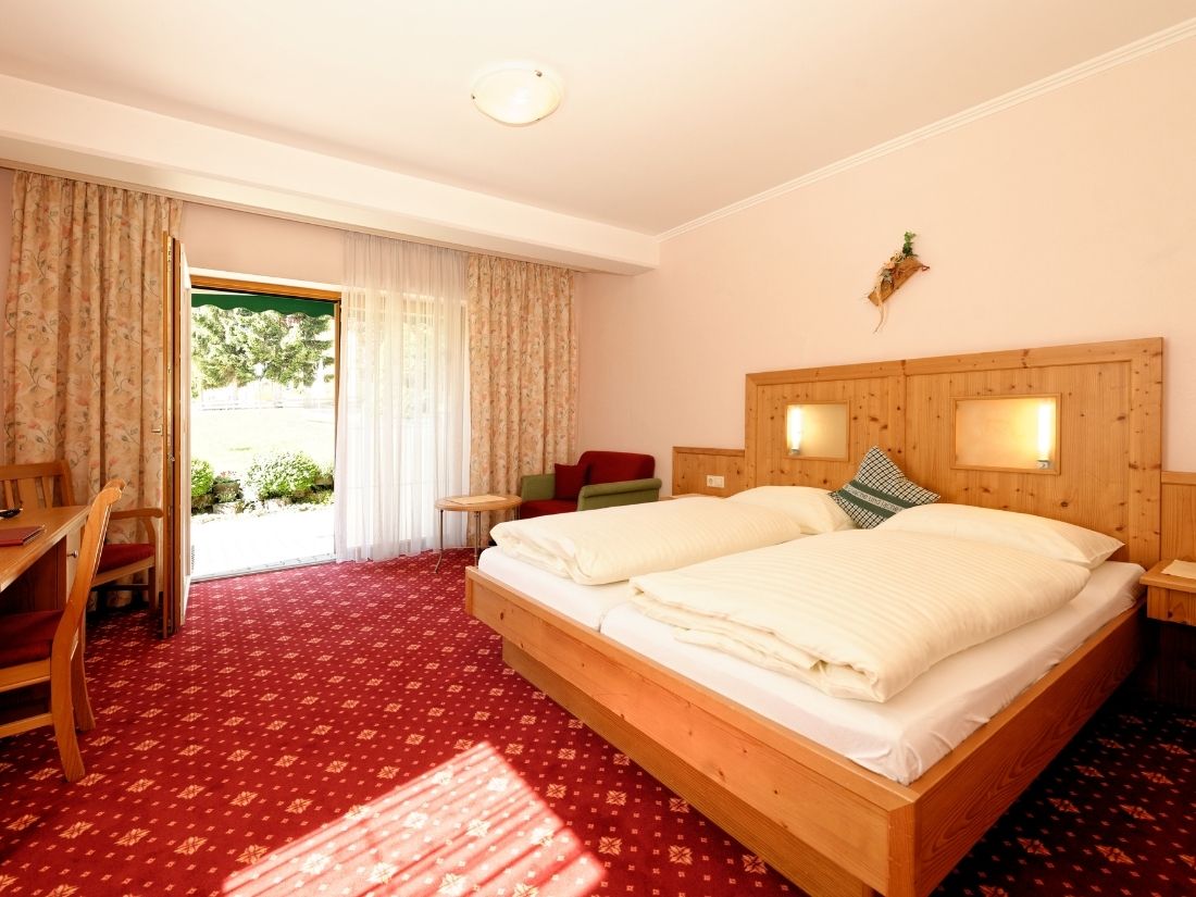 Unser 25 m² großes Doppelzimmer Comfort für 2 bis 3 Personen mit gemütlicher Sitzecke lädt zum Verweilen ein. Die Doppelzimmer dieser Kategorie verfügen entweder über einen Balkon oder eine Terrasse mit Sitzgelegenheiten, damit Sie die gute Bergluft genießen können. Vier unserer Doppelzimmer der Kategorie „Comfort” sind rollstuhlgerecht eingerichtet und somit ebenerdig erreichbar.