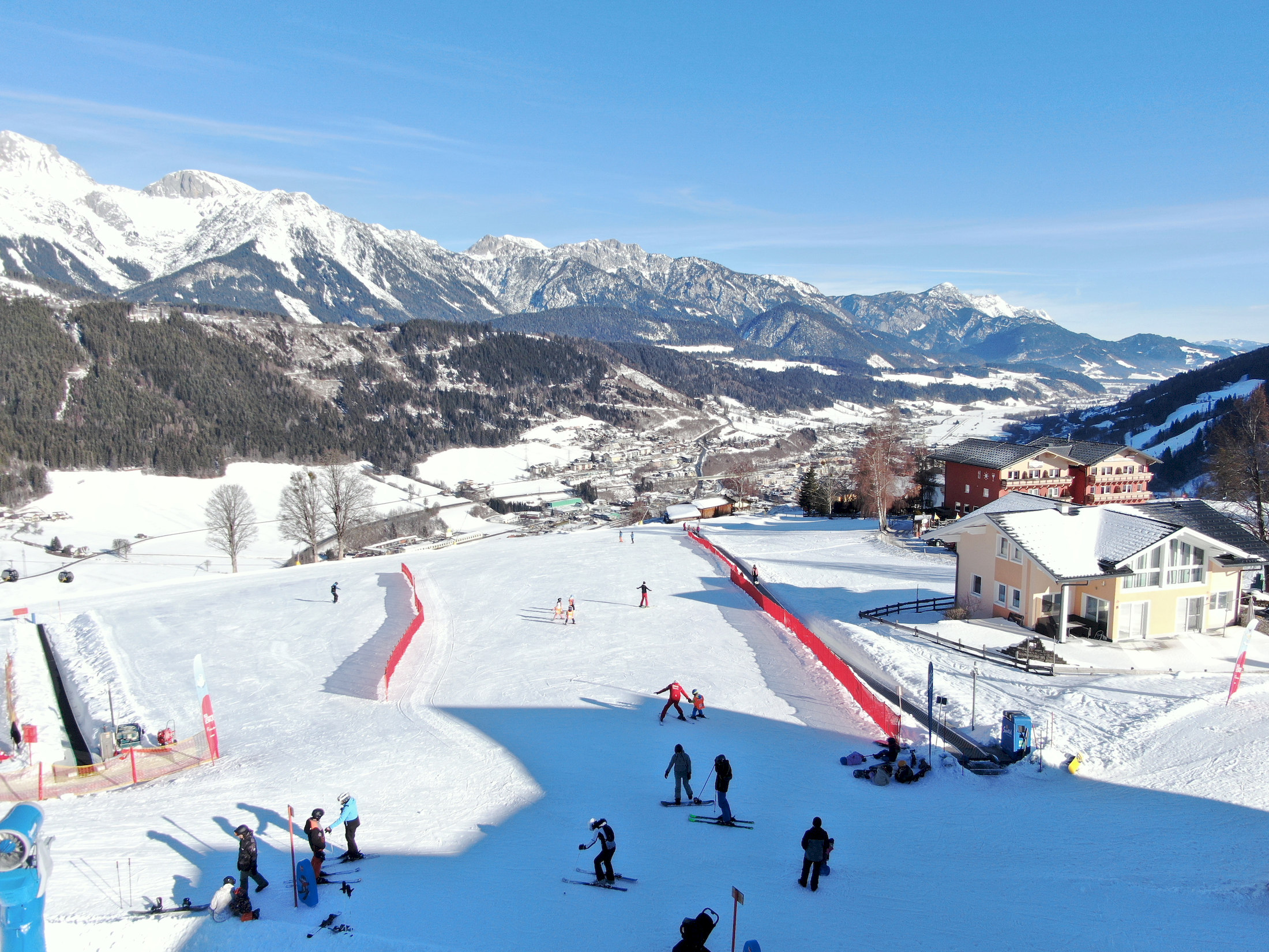 Im Hotel Moser fängt der Skispaß dort an, wo andere noch das Auto packen. Durch unsere einzigartige Lage direkt an der Piste genießen Sie den Luxus, dass der Übungshang und die Skischule Tritscher Ihre unmittelbaren Nachbarn sind. Während Ihre Kinder bei den Profis der Skischule spielerisch die ersten Schwünge im Schnee ziehen, können Sie entspannt von unserem Hotel aus zusehen oder selbst in das Pistenvergnügen starten. Auch das passende Equipment ist im Handumdrehen besorgt, denn das Sportgeschäft mit Skiverleih befindet sich direkt nebenan – komfortabler lässt sich ein Winterurlaub mit kleinen Pistenflitzern nicht gestalten.